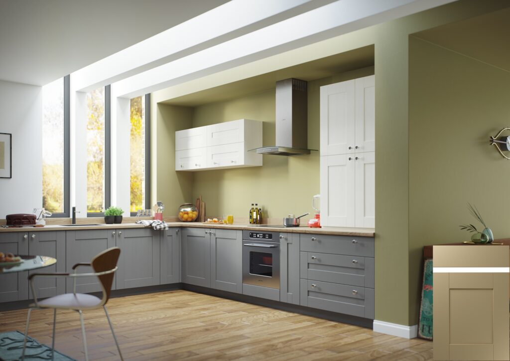 The door is crafted from a single piece of MDF and features a classic Shaker design, encased in durable PVC vinyl. With the V-Groove detail within the frame, this door presents a traditional shaker appearance. It is offered in 33 distinctive finishes, including ultra matte, high gloss, diverse wood-grains and painted wood-effect vinyls.